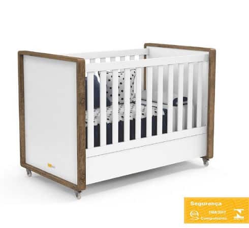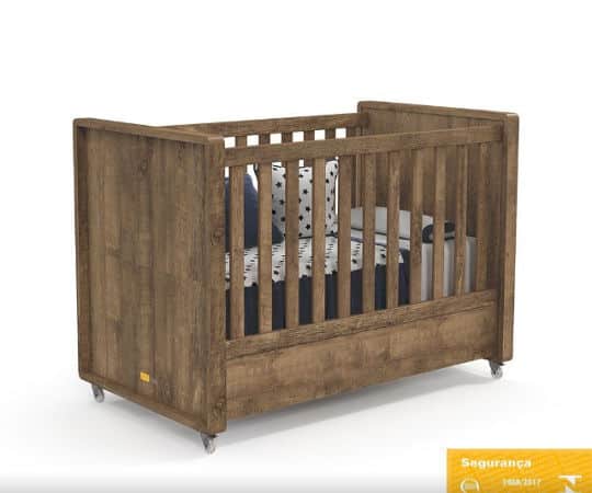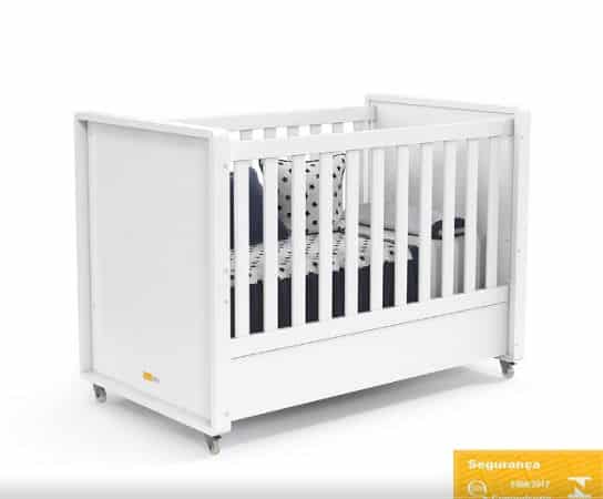 CERTIFICADO PELO INMETRO; 100% MDF; RODÍZIOS EM GEL, SENDO 2 COM TRAVAS; GRADES FIXAS; 3 REGULAGENS DE ALTURA DO ESTRADO; ACOMPANHA MOSQUITEIRO; PADRÃO AMERICANO; TRANSFORMA-SE EM MINI CAMA
