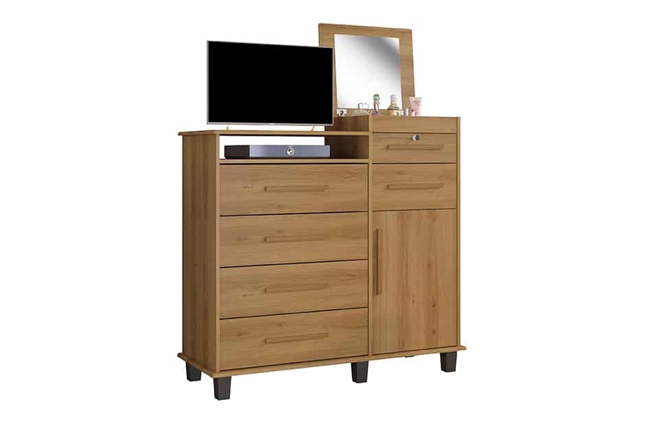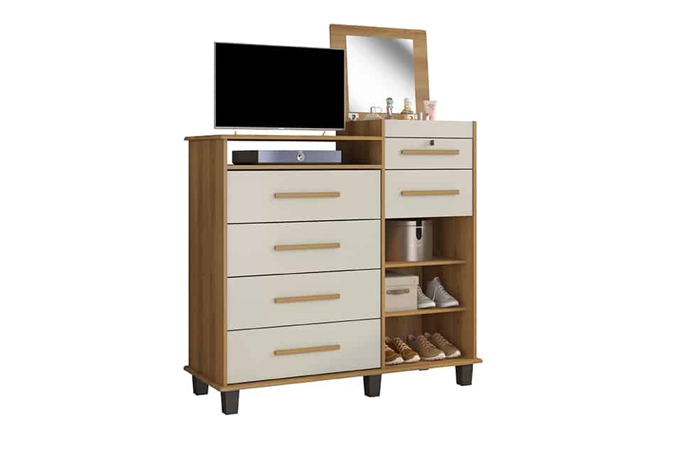DESCRIÇÃO: A CÔMODA BRILHANTE TEM 4 GAVETAS COM CORREDIÇAS TELESCÓPICAS, NICHO COM ESPELHO ARTICULADO. ALÉM DE 1 PORTA E GAVETA COM CHAVE